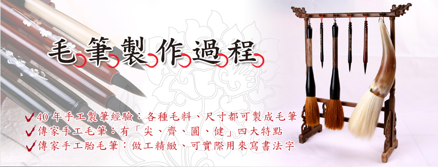 - ● 常見的毛料包含:羊毛、兔毛、狼毫(黃鼠狼)、赤牛耳毛、黑牛耳毛、白豬鬃、黑豬鬃、驢子毛、驢頸毛、驢尾毛、馬毛、馬頸毛、馬尾毛、白尼龍、赤尼龍、黃麻皮、嬰兒胎毛…等等。