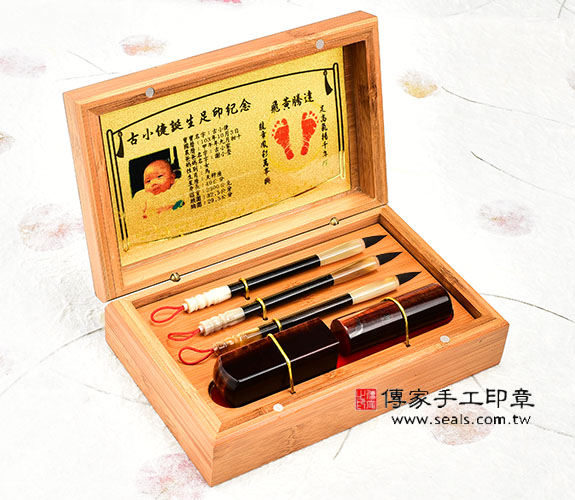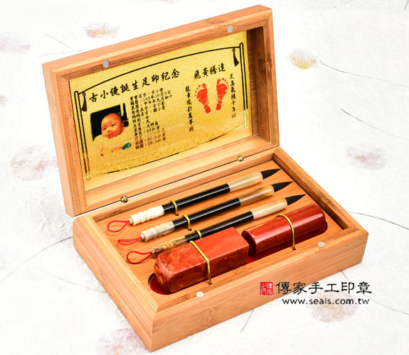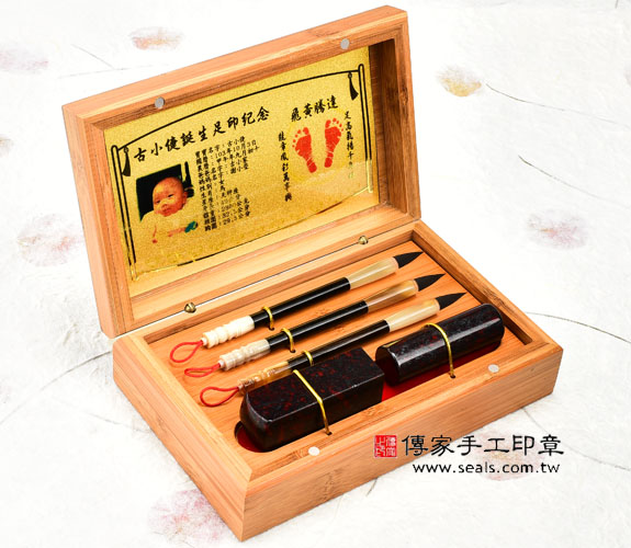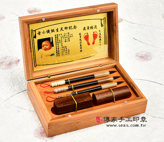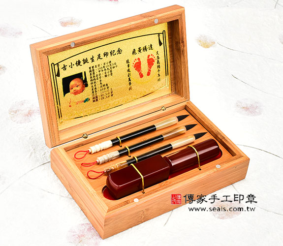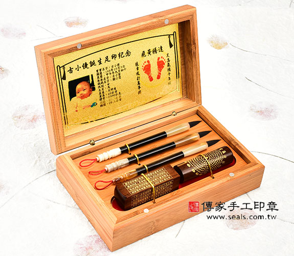 【袖珍型嬰兒三寶 (頂級天然竹盒烤漆+999純金足印+全手工胎毛筆+發財章)】