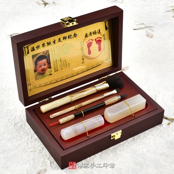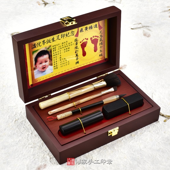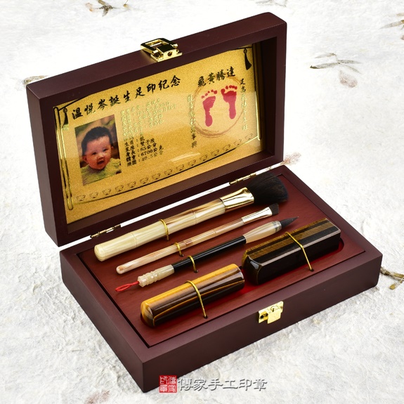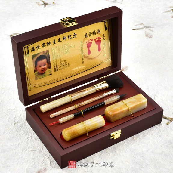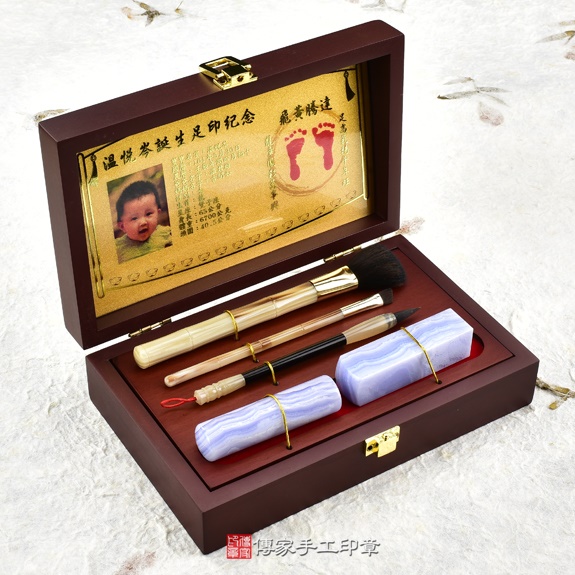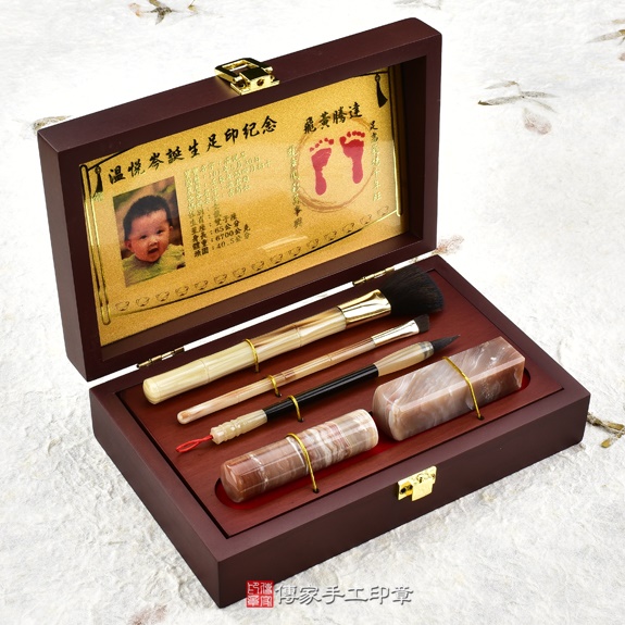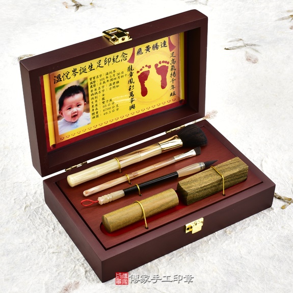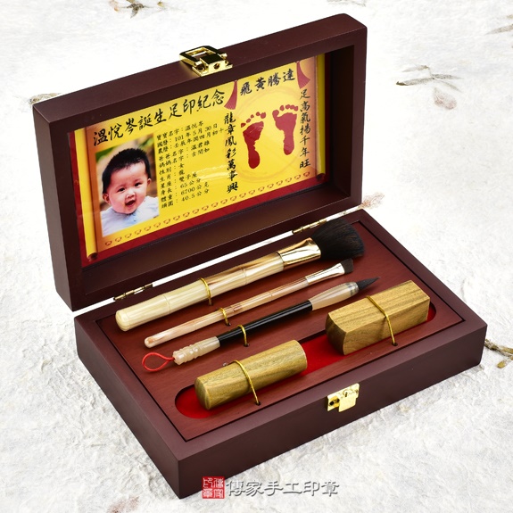 盒子可以選擇烤漆木盒,或是竹盒。足印可以選擇金足印,或是相片足印。胎毛刷筆桿有四種可以選擇。胎毛筆桿有多款可以選擇。臍帶印章的材質超過100種,可以依照寶寶的八字,推薦適合的印章。