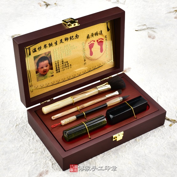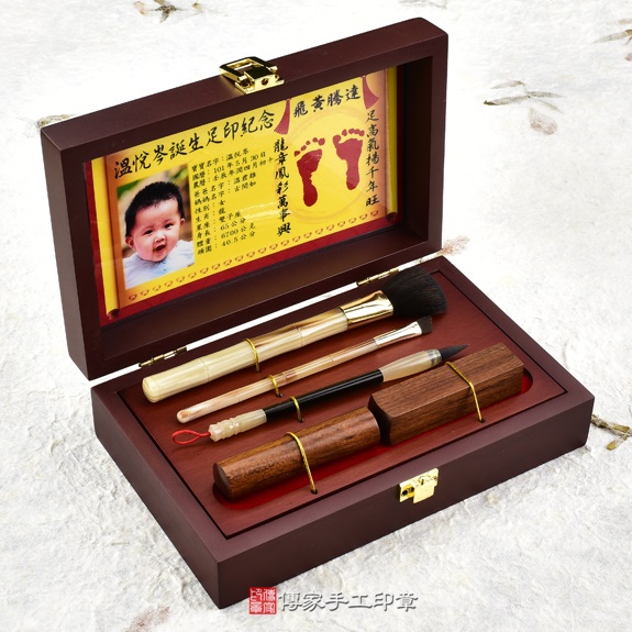 烤漆木盒女生胎毛筆刷嬰兒三寶。包含:紅檀木筆桿的胎毛化妝刷,紅檀木的胎毛筆桿,新疆黃玉臍帶印章,彩色相片足印。