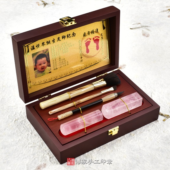 烤漆木盒女生胎毛筆刷嬰兒三寶。包含:紅檀木筆桿的胎毛化妝刷,紅檀木的胎毛筆桿,冰種粉晶臍帶印章,彩色相片足印。