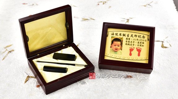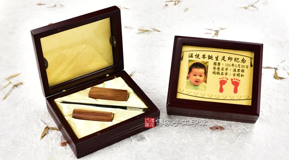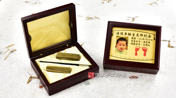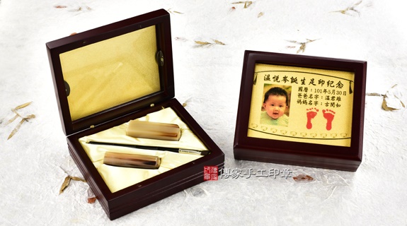 右邊為玻璃木盒、彩色足印照片、紅紫檀木臍帶胎毛印章、小支赤牛角胎毛刷