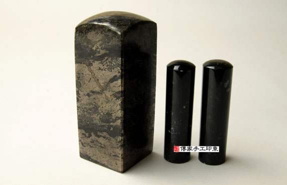 1. 傳家手工印章嚴選高級「黑金玉公司大小章」。「黑金玉」硬度很硬,重量是一般玉石印章的1.5倍,是非常罕見的印材。黑金玉的紋理十分獨特,握在手上具有相當的沉穩特性和沉重感。