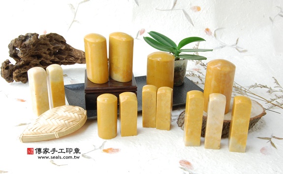 l 傳家手工印章嚴選高級「黃榕石」。黃榕石的硬度大約是4.5~5.5度,黃榕石的硬度不如璧玉,但對於中國人來說,『石之美者謂之玉』,也因為石材本身是金黃色,黃色是「帶財」的顏色,非常受到大家的喜愛。
