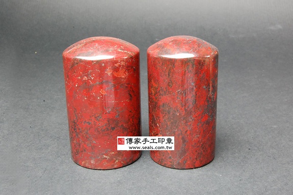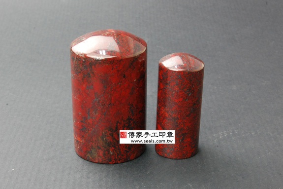 1. 紅礦雞血玉公司大小印章實際成品。紅礦雞血玉的公司印章,會用柱狀的造型,這樣印材可以充分被運用。這組紅礦雞血玉公司印章的尺寸:長3公分,寬3公分,高7.1公分。 紅礦雞血玉個人印章,雙章,一圓一方。圓章象徵「財源滾滾」,適合當做銀行開戶使用。方章象徵「方方正正」,可以在簽約、購買房子時,可以使用。六分個人開運印章尺寸:長1.8公分,寬1.8公分,高7.1公分。每一個紅礦雞血玉印章,會有屬於自己的礦色和紋路。注意:因為紅礦雞血玉是天然的礦石,所以印章的尺寸會隨著原礦而調整,大小不一致。