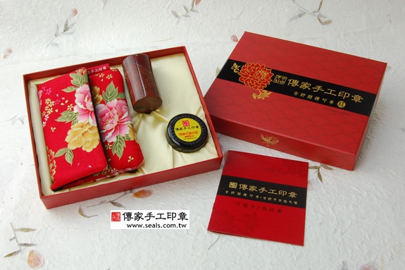 一. 傳家手工印章,出貨包裝精美大器,完整全配出貨禮盒包裝內容包含:高級燙金牡丹花吉祥紅色禮盒(有手提握把)1個、加厚防震日式風格印章外出攜帶手工袋1個(手工帶可以放雙章,顏色和花色很多,男生女生都可以使用)、獨家手工艾草印泥1個(日本印油)、印鑑卡保證書1張。