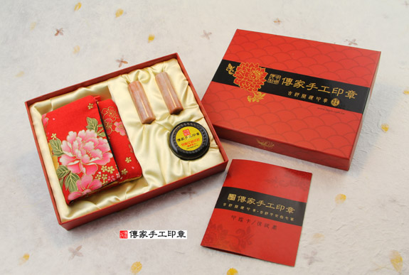 一. 傳家手工印章,出貨包裝精美大器,完整全配出貨禮盒包裝內容包含:高級燙金牡丹花吉祥紅色禮盒(有手提握把)1個、加厚防震日式風格印章外出攜帶手工袋1個(手工帶可以放雙章,顏色和花色很多,男生女生都可以使用)、獨家手工艾草印泥1個(日本印油)、印鑑卡保證書1張。