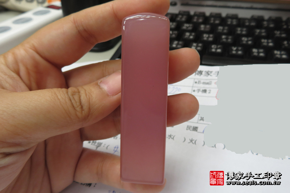 這是劉小姐挑選的印章材質-粉紅瑪瑙。