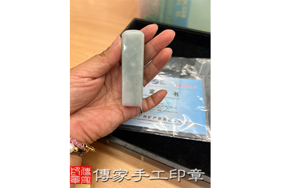 翡翠在古代有著身分地位的象徵,非富即貴之人才能使用,因此具有收藏的價值。故余先生購買翡翠印章傳家手工印章也有附上鑑定書以茲證明。