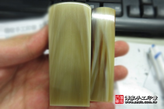 這是凌先生挑選的印章材質,漂亮色赤牛角,